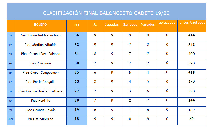 A continuaciĂłn os dejamos imagen de las clasificaciones finales de la Liga Joven ZGZ de Baloncesto Temporada 2019-2020.
